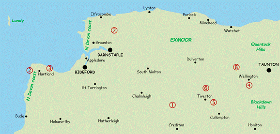 route. Read the walk safety information, and click for a key to the symbols used on the sketch maps in the instructions. AW1 Witheridge, Black Dog and Washford Pyne ♦♦ 9 mile circular AW2 Hartland Point and Hartland Quay ♦♦♦ 8 mile circular AW3 Exmansworthy and the edge of Clovelly ♦♦♦ 8.7 mile circular AW4 Wellington and the Monument ♦♦ 5.7 mile circular AW5 Tiverton and Halberton